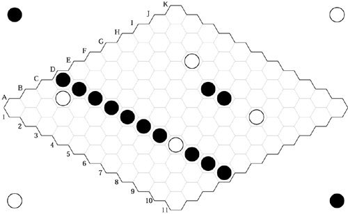 I've also published a series of articles on Hex in Abstract Games Magazine (here's the introductory article). This series started out summarising the key elements covered in the book, but has since become an outlet for puzzles and new ideas about the game as they develop. Article #4 in the series described a simple algorithm that plays a surprisingly strong game given its lack of strategic knowledge and search. You can download the Hex Maniac executable for Windows here and the C++ source code for a simplified command line version here. Bear in mind that Hex Maniac is really just a proof-of-concept and not a strong opponent. For a good computer player for PC you need look no further than Vadim Anshelevich's Hexy, or there is a Mac player called Hexomania. A Zillions of Games rules file for playing Hex can be downloaded here. |
