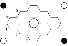 The small 3x3 game on the right shows a simple introductory puzzle suggested by Tim Robinson: Prove that B2 is an easy win for the opening player. What other opening moves are also a guaranteed win for the first player on the 3x3 board? This demonstrates the potential strength of the opening move and the need for the swap rule. |