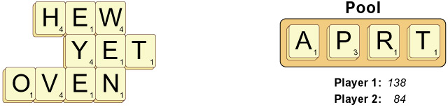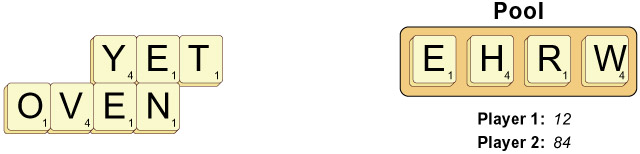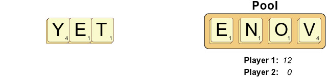 Player 1 starts by making the word YET, then replenishes the pool. Player 1 scores 12 pts for making YET: 6x2 = 12.