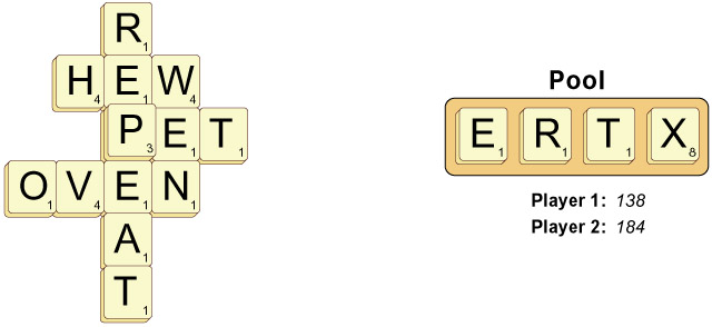 Player 1 then plays E, X, R, T to score 495 pts for making the five words EXERT, RE, HEX, OVER and AT: (12x4 + 2x1 + 13x2 + 7x3 + 2x1) x 5 = 495. Longer words such as REPEAT are good, but it's the combination of word-length and word-count multipliers that yield really big scores.