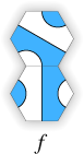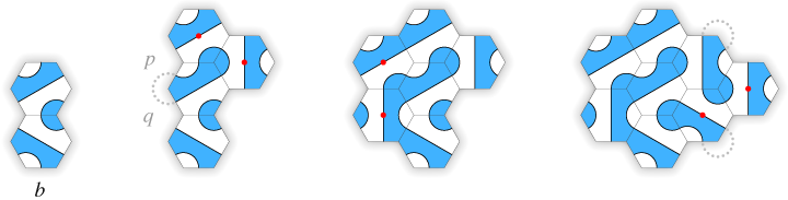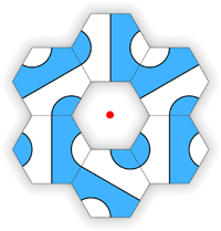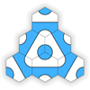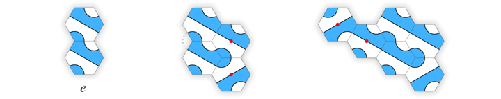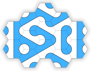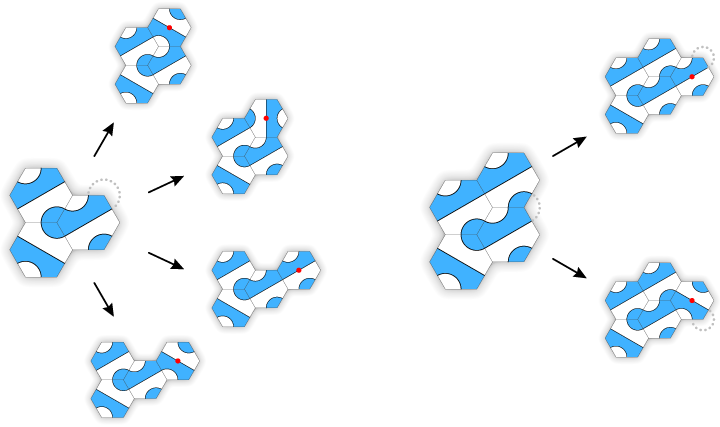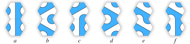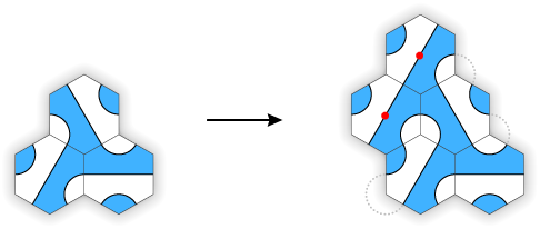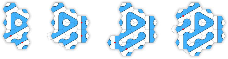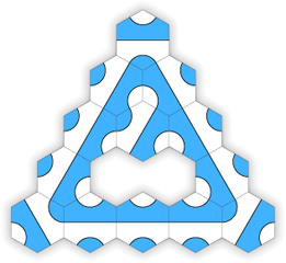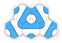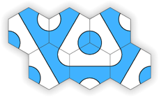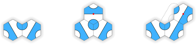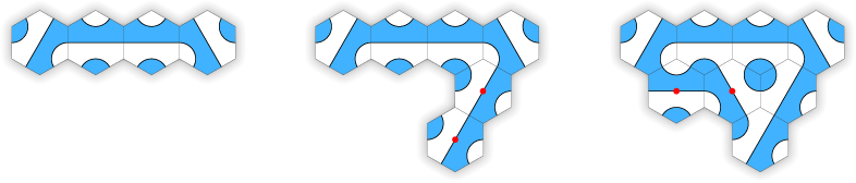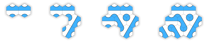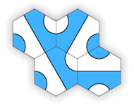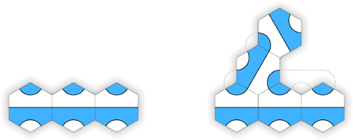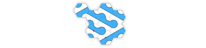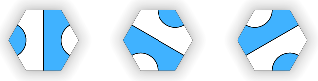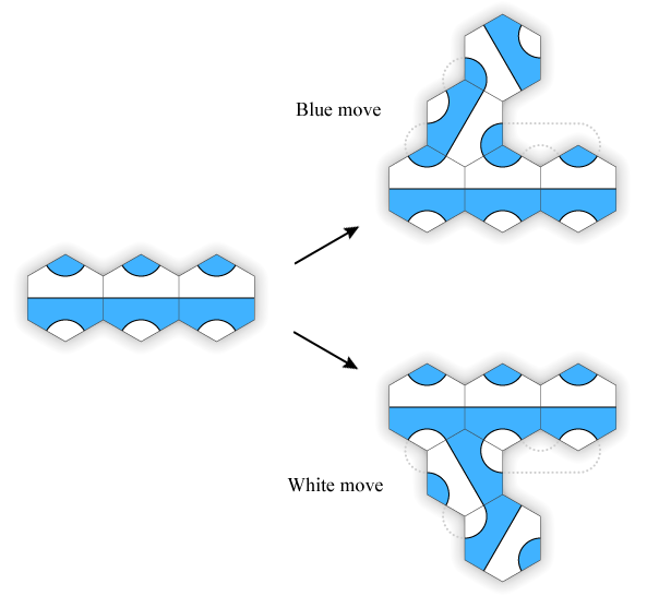 Tiles: Two players, White and Blue, share a common pool of 48 hexagonal Palago tiles. Each tile contains a straight and a circular tip of each colour, and may be oriented in three ways such that edge colours always match.
