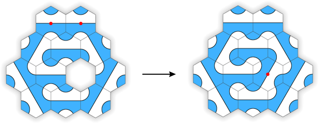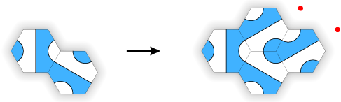 However, White can quickly turn the position to their advantage by playing the two tiles shown in Figure 6 (left). This move closes the group except for the freedoms within the hole, which White can close on their next move to win (right).