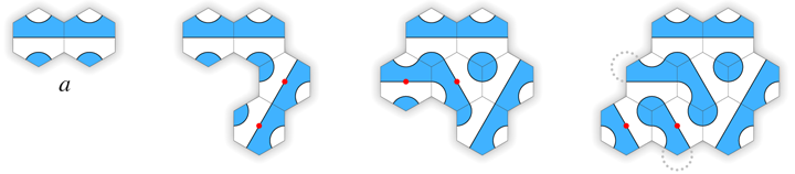 Opening a is a provable loss for White, as shown in Figure 15. If Blue replies with a rotation of a as shown then White is forced to close the open mouth, allowing Blue to set up a winning fork next turn (right).