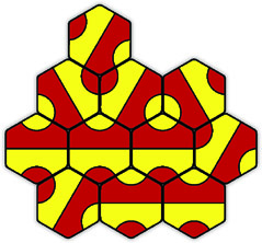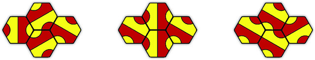 Play: The first player places a tile in the middle of the playing area, the second player places a tile to touch it such that edge colours match, then players take turns adding a tile to touch at least two existing tiles such that edge colours match.
