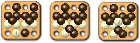 The most likely continuation of play is shown below, with Black eventually winning the pile-up to connect across to their main group and win the game. Note that Black could have captured two White pieces by moving in the lower left hole with move 6, but White could then have immediately recaptured to set up a win. Capture is not always the best policy!