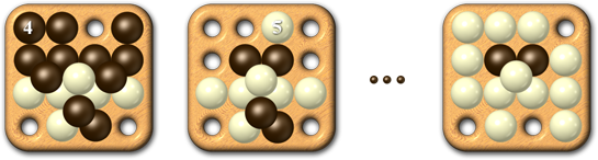 Instead, Black is again forced to fill an eye with move 6 allowing White to capture the main Black group with move 7. However, this time Black has more surviving (pinned) pieces than White due to the recent pile-up, which tips the balance of the game. Black will win by a piece or two from this position, regardless of which player runs out of moves.