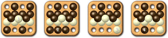Move c (alternative): The following figures show an alternative line of play for move 1 (c), with White move 3 pinning the vulnerable Black group rather than capturing it. This may seem like an odd choice but allows White to win the pile-up with move 5 and introduces a twist; Black cannot immediately recapture the White group! A move in the lower right corner looks promising for Black, but this would be an illegal suicide move as it would have no freedoms after its execution, due to the pinned White pieces.