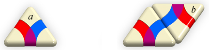 Equipment: Two players, Red and Blue, share a common pool of 54 triangular tiles. The front and back faces of each tile have a red arc and a blue arc that overlap at one edge. The arc colours on the front and back are inverted.