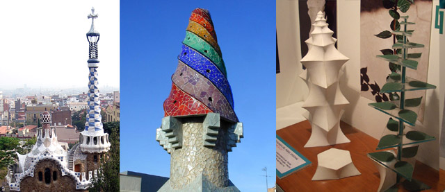 Figure 1. The tower at Park Güell, a trencadís chimney pot at Güell Palace, and the abelian sculpture study in the Sagrada Familia museum.