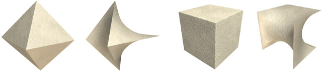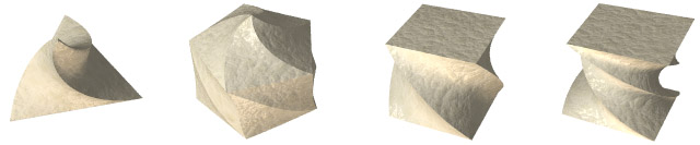 Figure 10. Twisted primitives: tetrahedron, icosahedron and cube (90° and 180° twists).