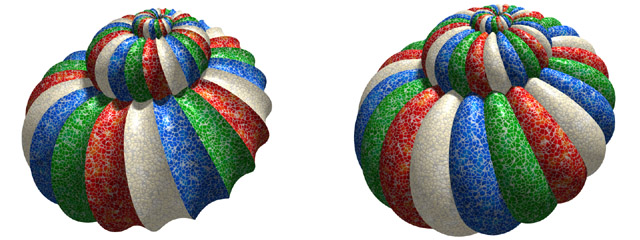 Figure 13. Four tiled bands twisted around logarithmic spiral surfaces, sagged (left) and inflated (right).
