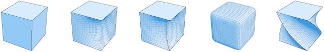 Figure 2. A cube and four basic operations applied to it: relax, sag, smooth and twist.