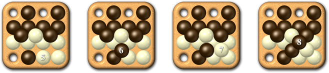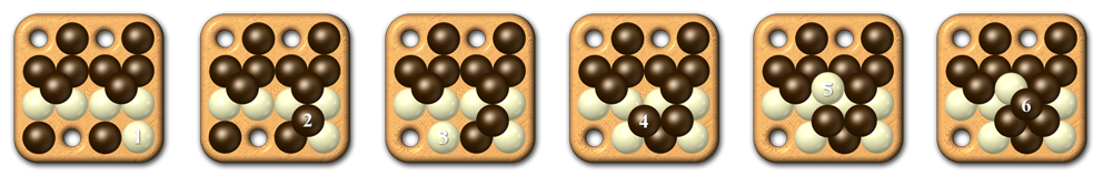 The most likely continuation of play is shown below, with Black eventually winning the pile-up to connect across to their main group and win the game. Note that Black could have captured two White pieces by moving in the lower left hole with move 6, but White could then have immediately recaptured to set up a win. Capture is not always the best policy!