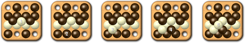 Move c (alternative): The following figures show an alternative line of play for move 1 (c), with White move 3 pinning the vulnerable Black group rather than capturing it. This may seem like an odd choice but allows White to win the pile-up with move 5 and introduces a twist; Black cannot immediately recapture the White group! A move in the lower right corner looks promising for Black, but this would be an illegal suicide move as it would have no freedoms after its execution, due to the pinned White pieces.