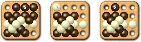 Instead, Black is again forced to fill an eye with move 6 allowing White to capture the main Black group with move 7. However, this time Black has more surviving (pinned) pieces than White due to the recent pile-up, which tips the balance of the game. Black will win by a piece or two from this position, regardless of which player runs out of moves.