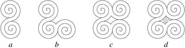 Figure 2. Spiral packing: (a) a seed pair, (b) simple branch, (c) fitting to one other, and (d) fitting to two others.